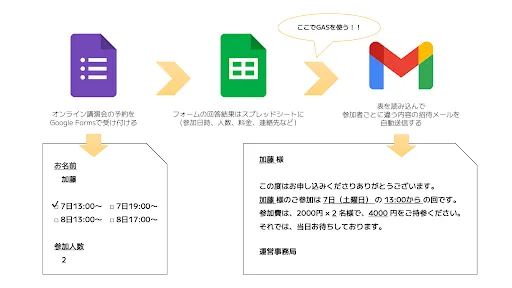 申し込みをした人に対してGmailから招待メールを送信する際,GASを使うと,自分の手で本文を入力したり送信したりせず,宛先・氏名・参加人数・日時・参加費などの情報を表から自動で反映して,自動で送信することが可能です.