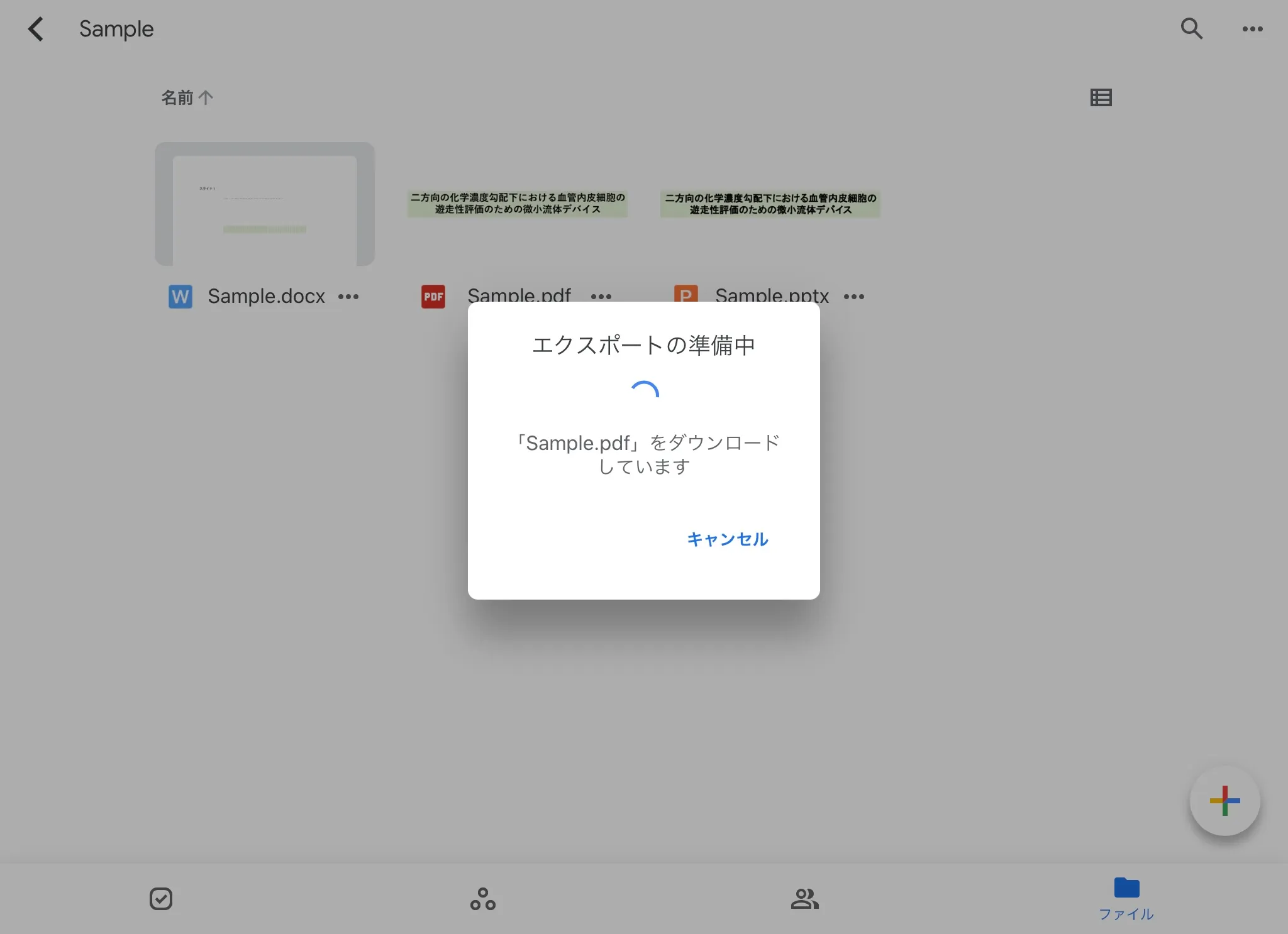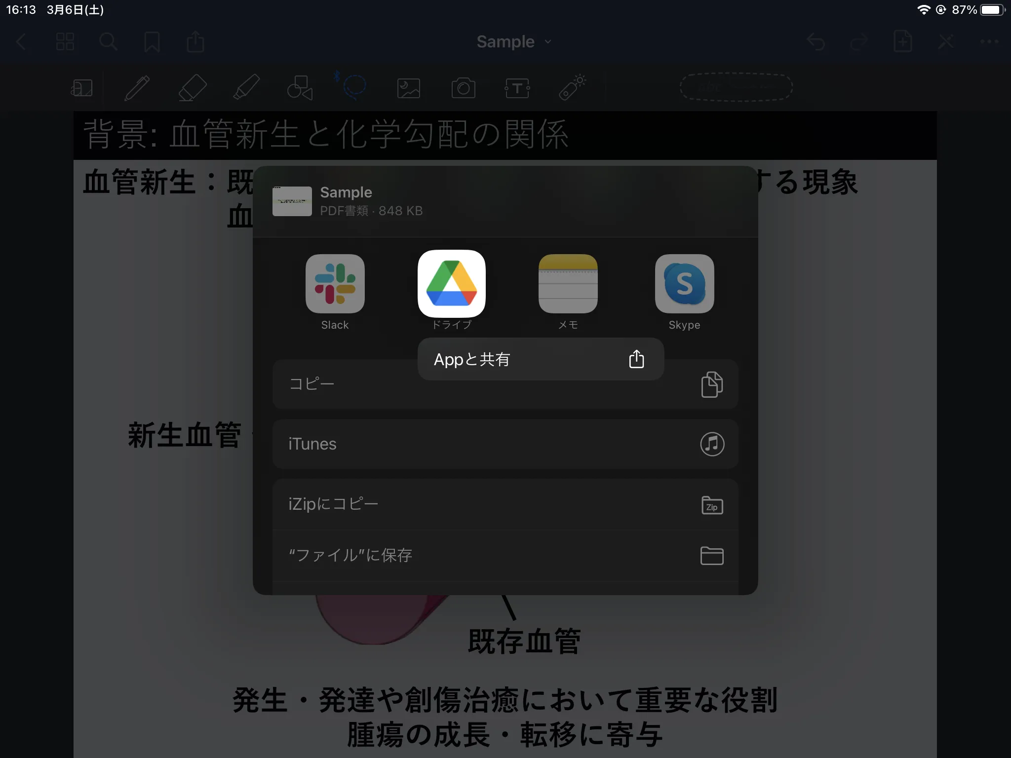 3. 書き出したファイルを保存または共有するためのアプリケーションを選択します.書き出したファイルは,Googleドライブに保存したり,Slackやメールで添付送信をしたりすることができます.本記事ではGoogle ドライブに保存する場合の手順を紹介します.