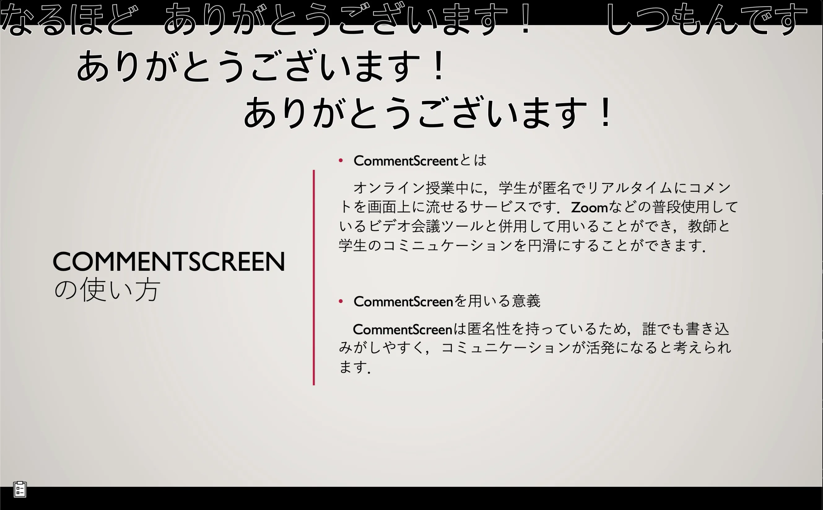 CommentScreenは投稿されたコメントを,ZoomなどのWeb会議システムの画面上を横に流れるように表示させることができるサービスです.