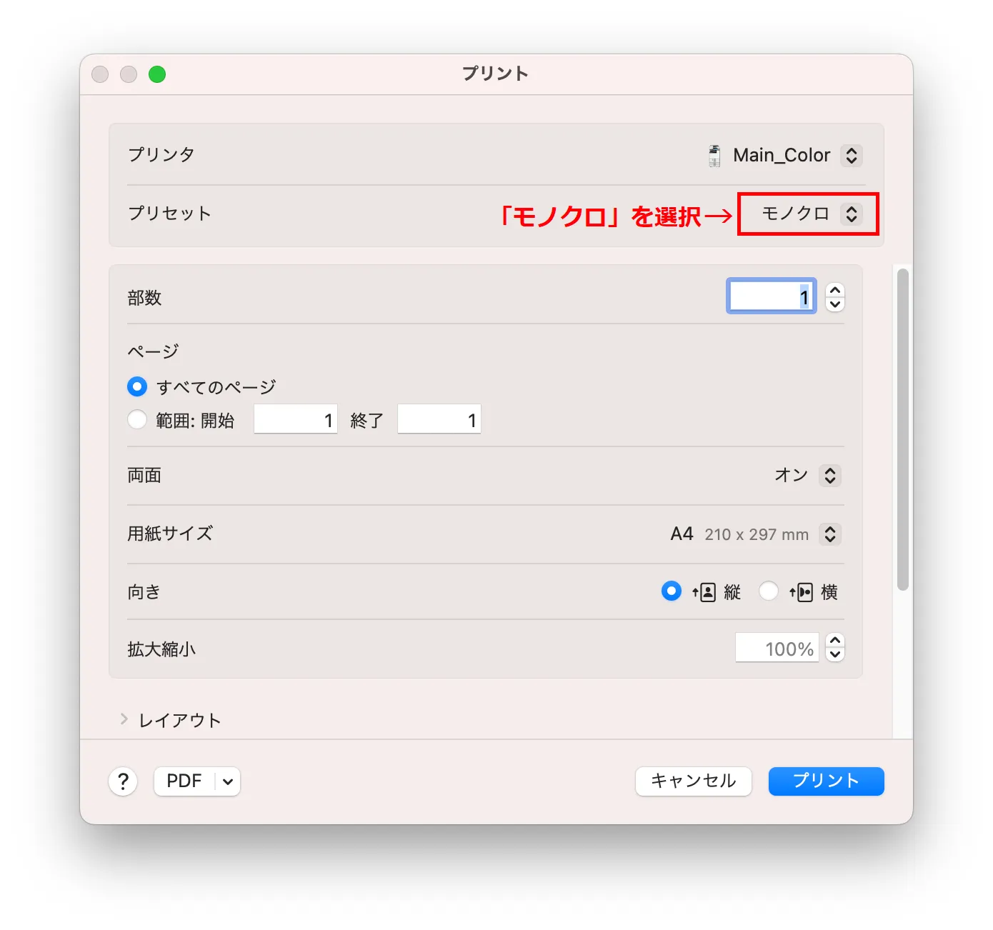 現在,Mac環境ではMain_Monoを選択できないため,Main_Colorを選択したうえで,下の画像のように,プリセット設定で「モノクロ」を選択してください.「モノクロ」以外を選択すると,黒文字だけの文書であってもカラー印刷として扱われ,カラー印刷料金が課金されてしまいます.