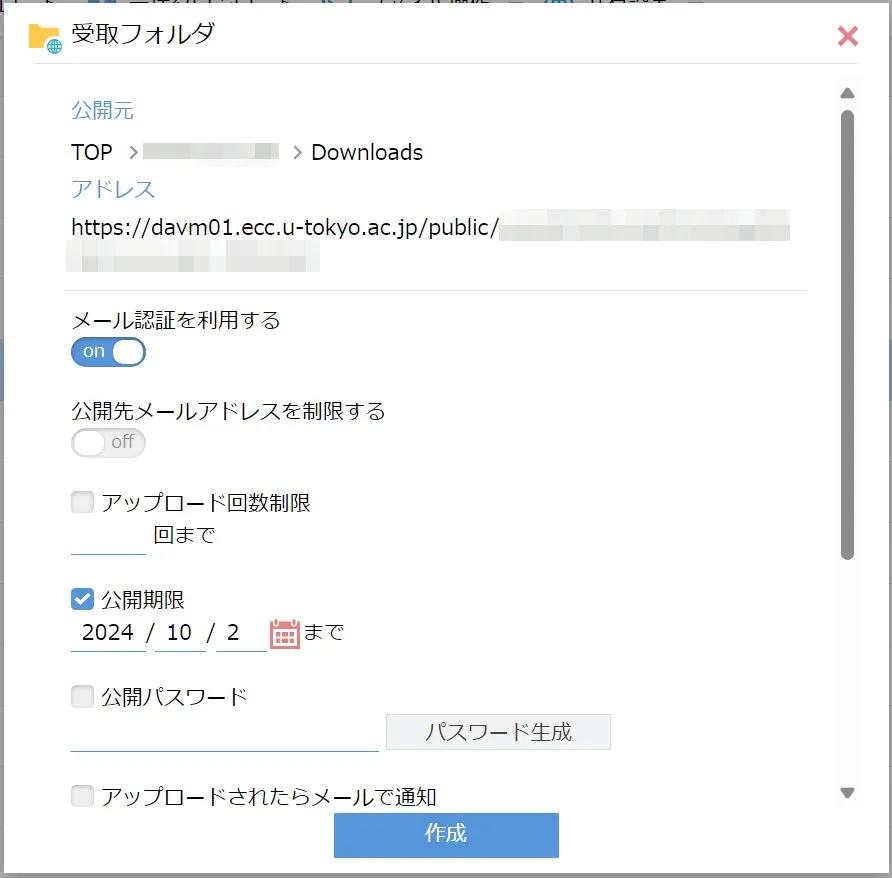 3. 設定画面が表示されるので,メール認証や公開期限等を設定してください.表示されているリンクをコピーし「作成」を押してください.