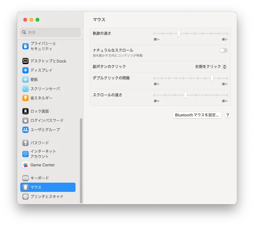- 左側の設定項目を下の方までスクロールして「マウス」をクリックしてください.