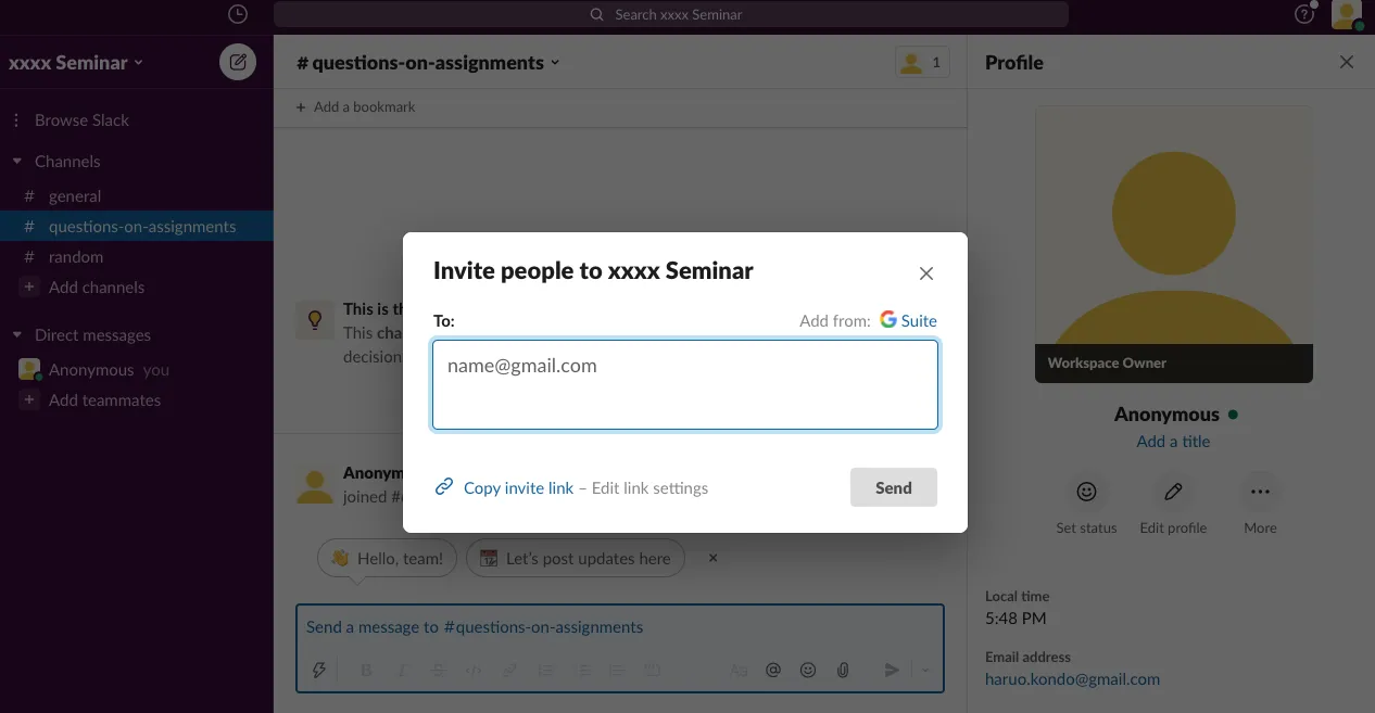 When using a Slack workspace in class, it is a good idea to set class rules for using the workspace, and to share the rules with students in advance. In particular, please be careful of handling personal information such as email addresses (See Manage email display (Slack help center).).
