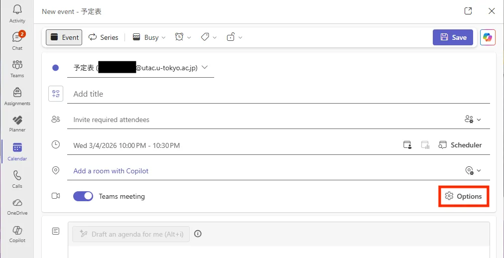 - If creating it as a new event, turn on the “Teams meeting” toggle if it is off.