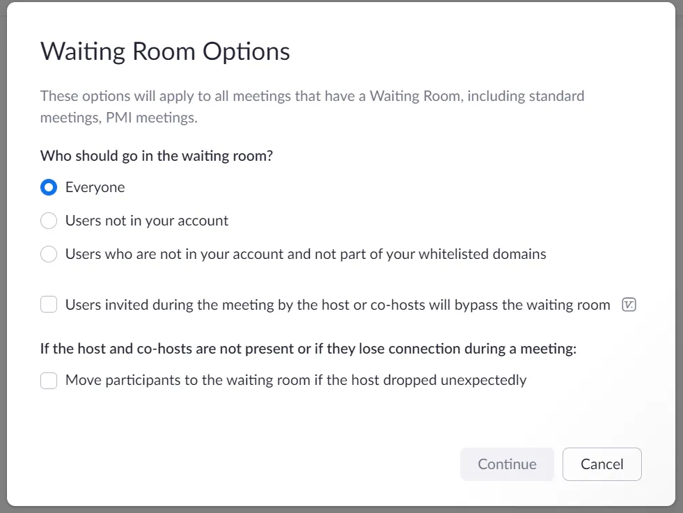 • Method B: Place participants entering without a university account in the Waiting Room