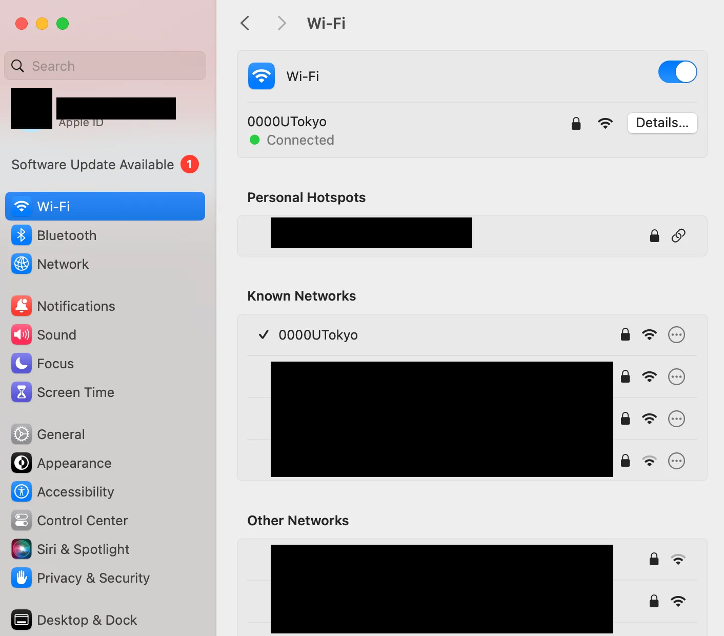 UTokyo Wi-Fi is a Wi-Fi service available to members of the University of Tokyo for educational and research purposes. Please refer to UTokyo Wi-Fi page first, which summarizes the general instructions for using the UTokyo Wi-Fi. If you still need the detailed instructions for terminal with macOS 13 Ventura, please refer to this page.