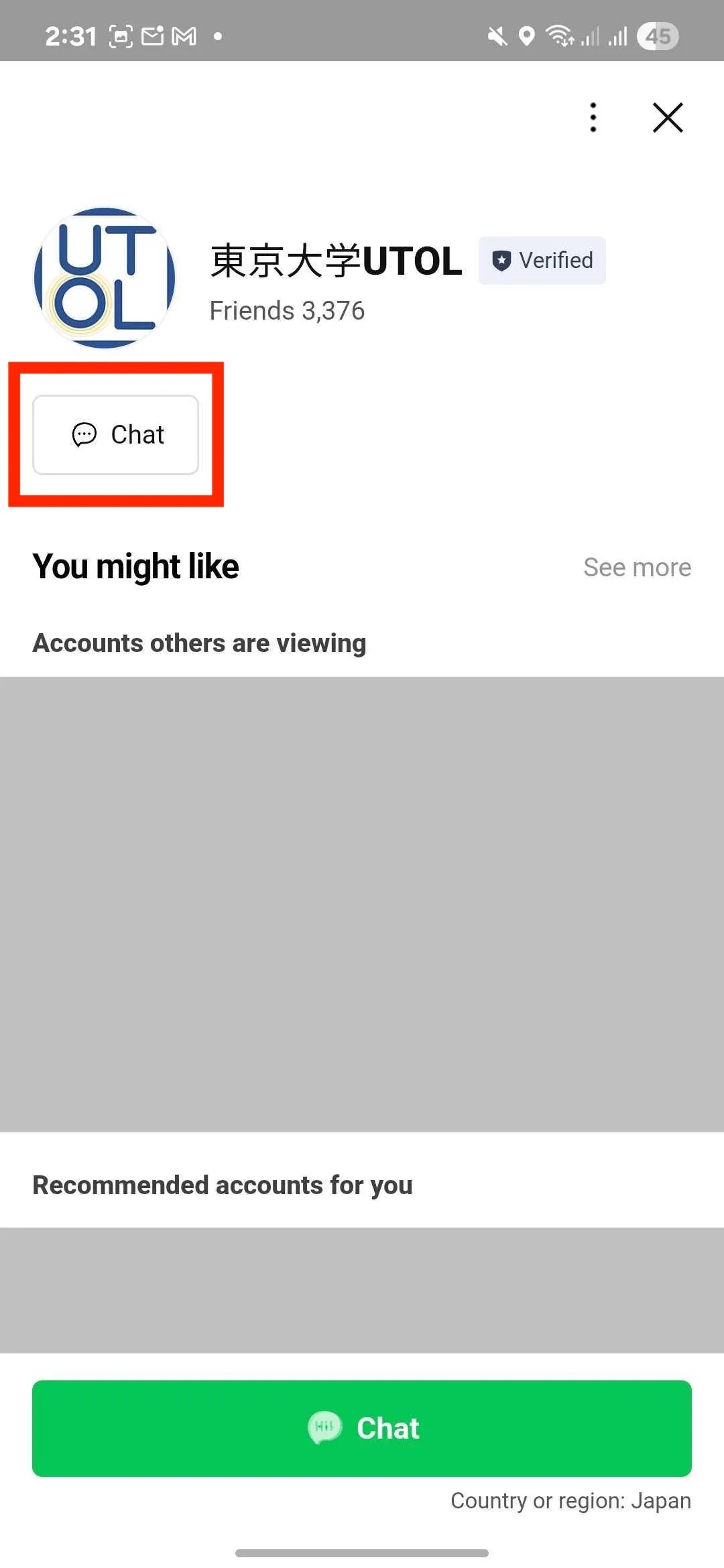 - Open the LINE App, and go to the chat room with “東京大学 UTOL”.