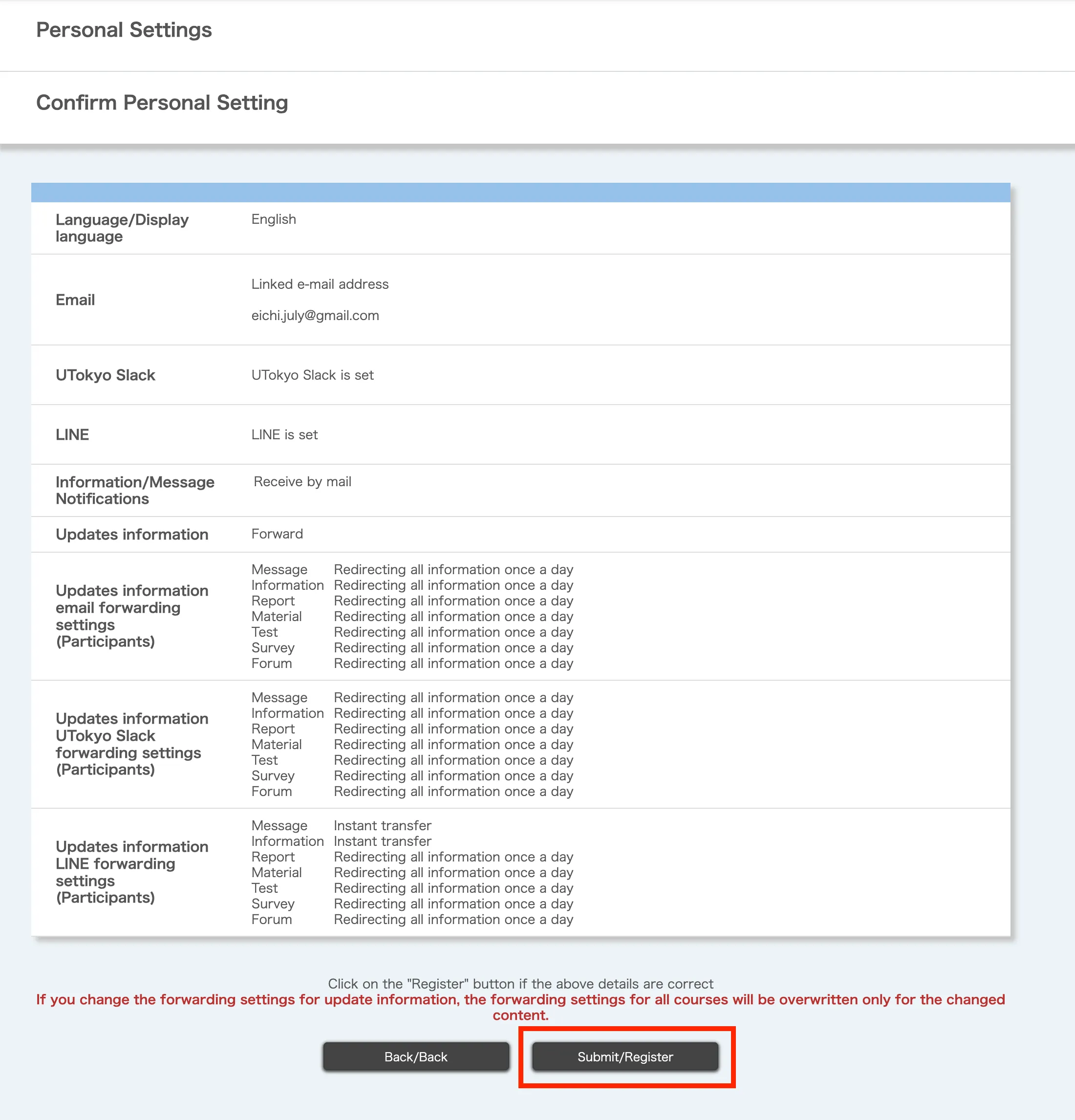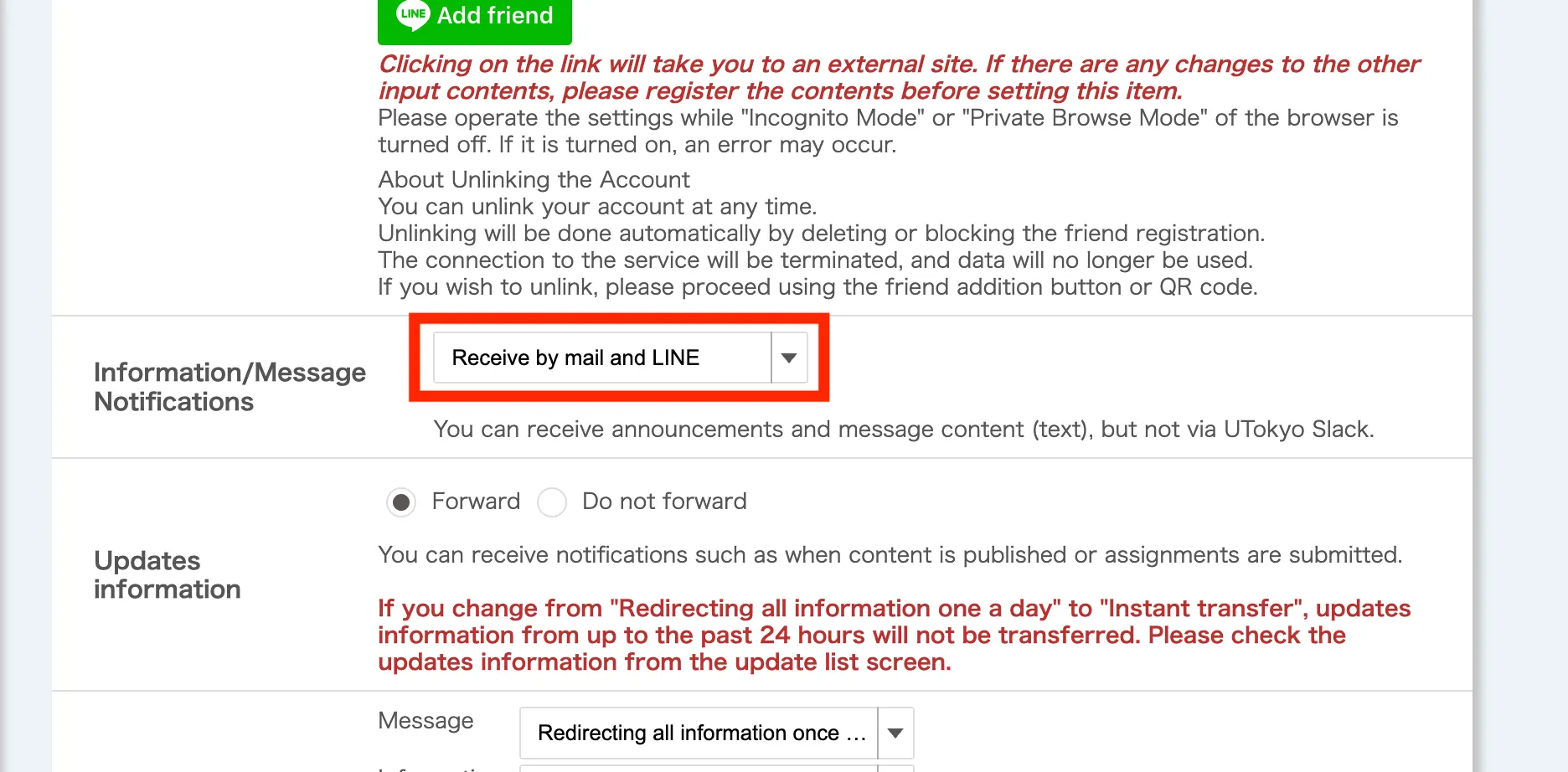 - Move to the “Updates information” > “Update information email/UTokyo Slack/LINE forwarding settings”