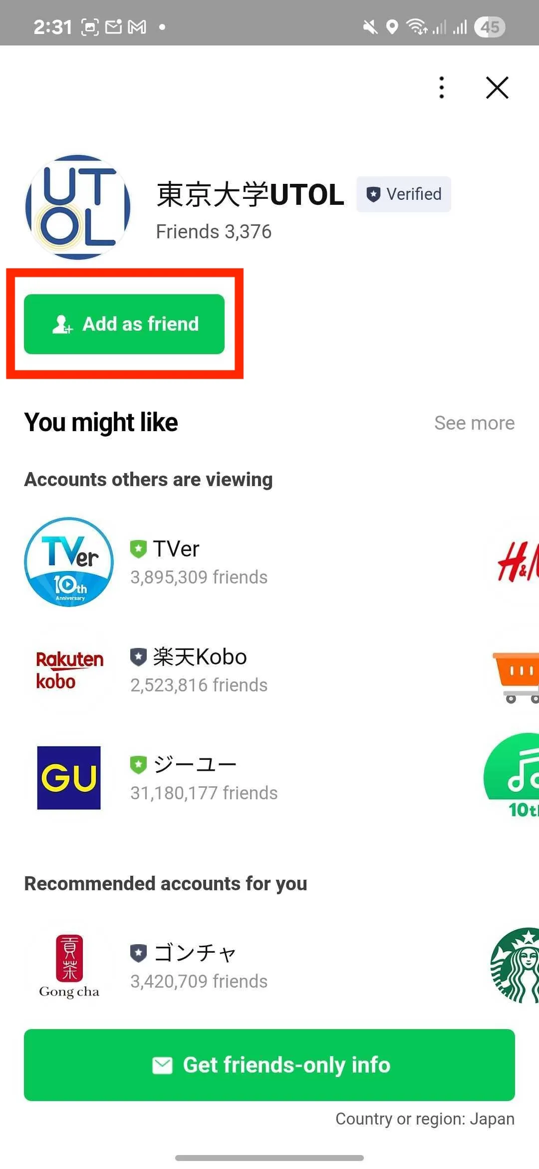 - Look for “東京大学UTOL” under the “official account” tab, or search for it in the search window, then press and hold the “東京大学UTOL”.