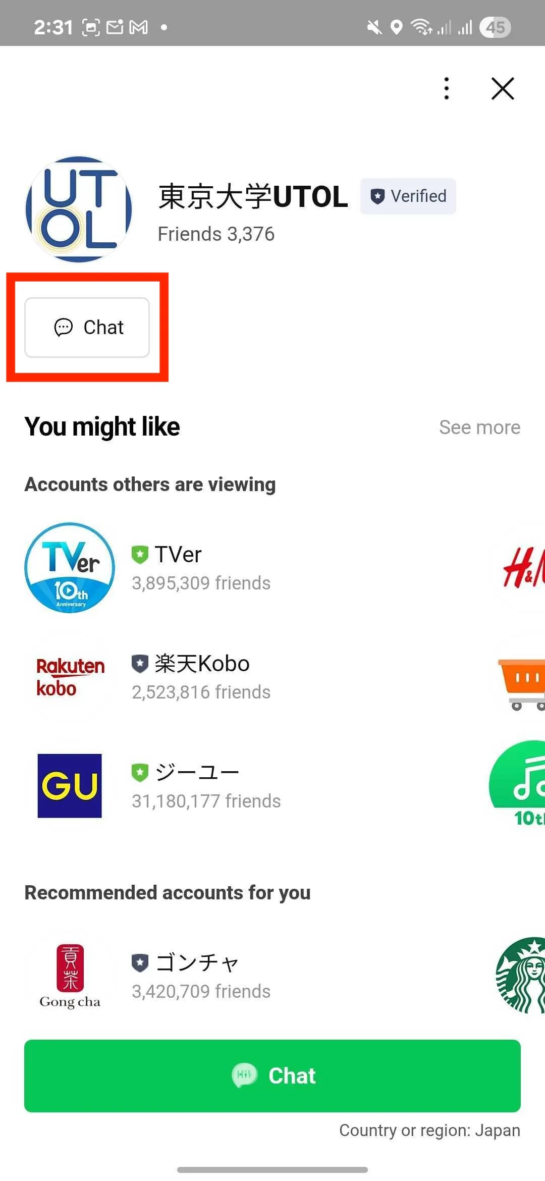 - Open the LINE App, and go to the chat room with “東京大学UTOL”.