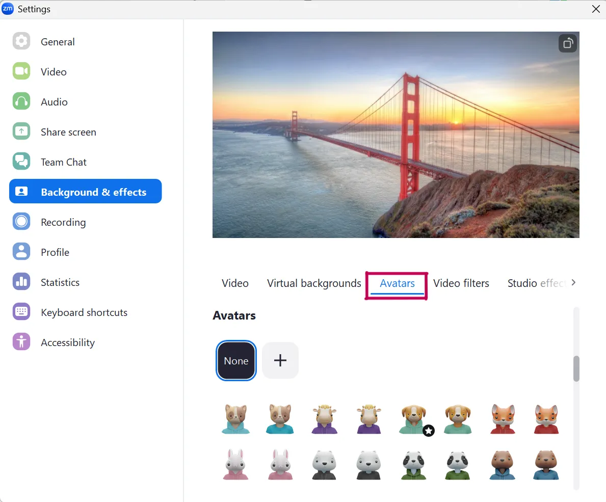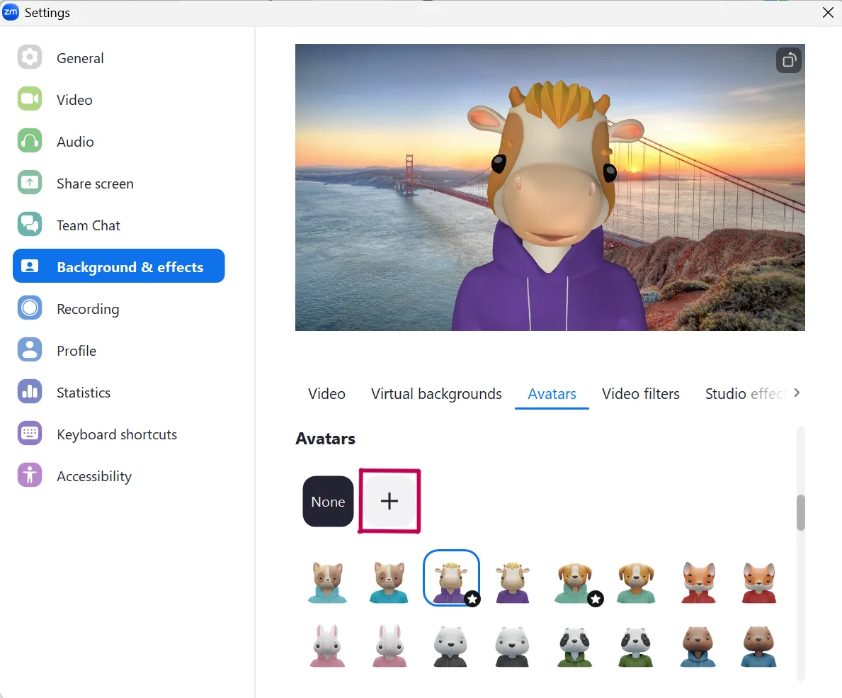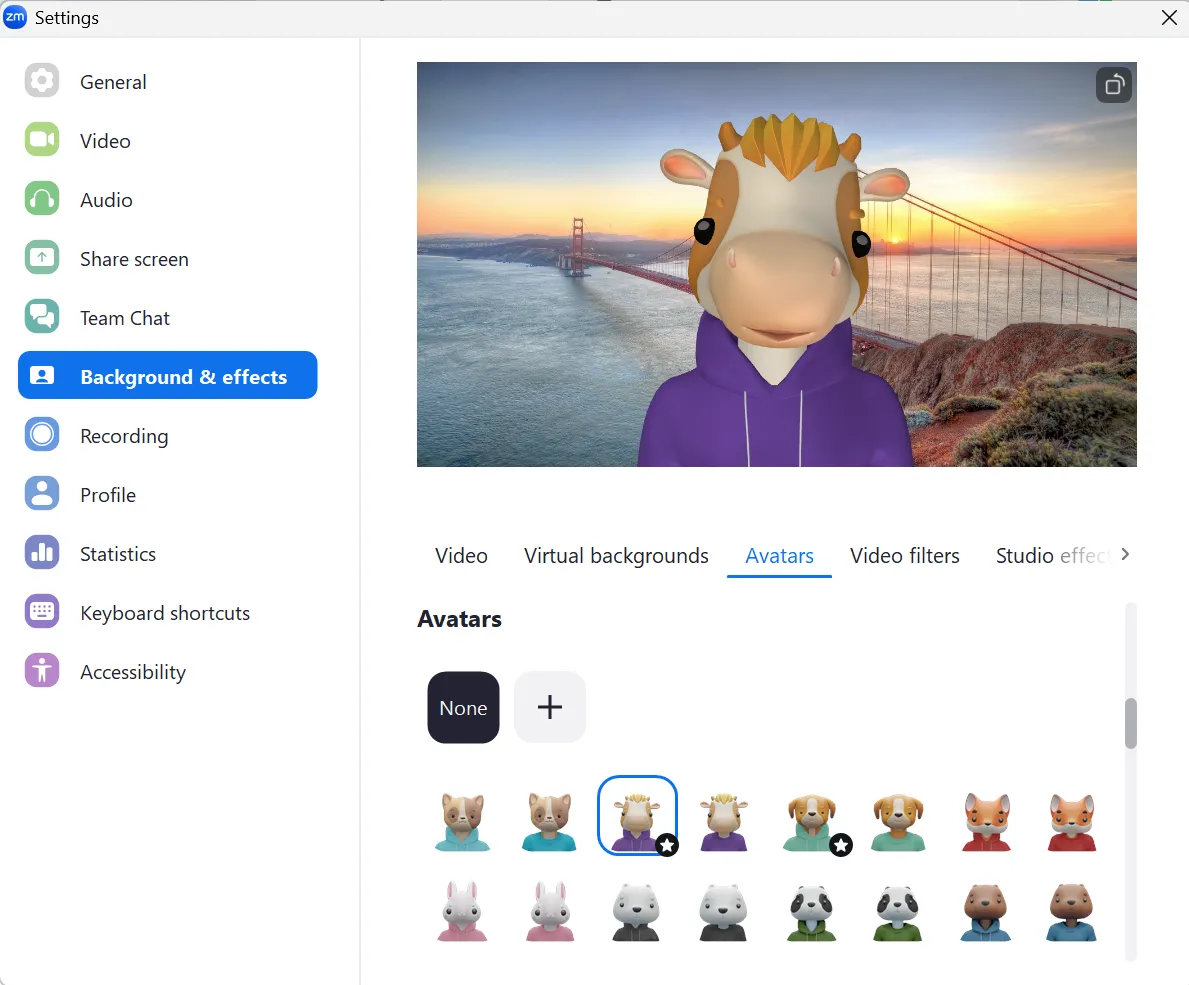 3. Select the avatar of your choice. (When an avatar is set, the camera background will disappear, and only the avatar will be displayed. If a virtual background has been set, the image will be displayed behind the avatar.)