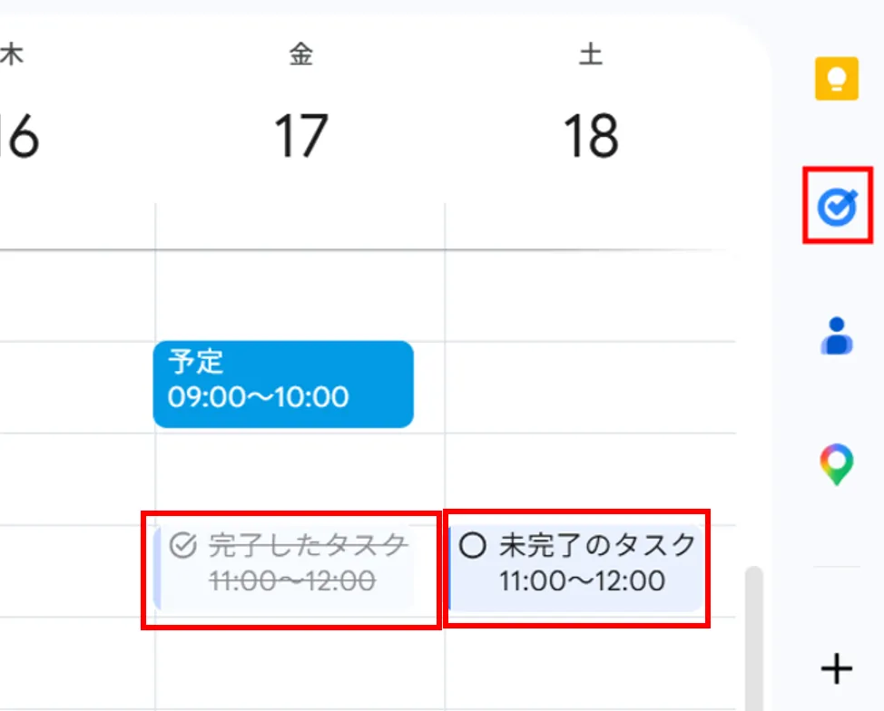 やるべきこと(タスク)をGoogleカレンダーに登録することができます.タスクを登録することで,タスクを実施する時間と他の予定との調整をしやすくしたり,リマインダーとして利用したりできます.なお,タスクの作成は画面右上にあるチェックマーク([ToDoリスト]に切り替える)からも行うことができます.カレンダーにおいて,タスクは下の画像の赤枠のように表示されます.