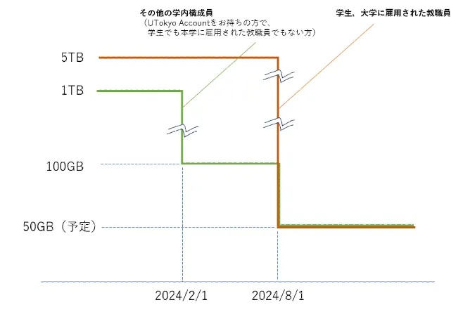 2024年2月1日:東京大学に雇用されている教職員には該当しないUTokyo Account保持者(学生は除く)のストレージ上限が縮小