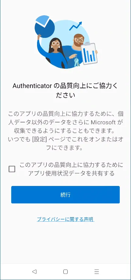 - スマホでMicrosoft Authenticatorアプリを起動してください.なおこの際,インストール後初めてアプリを起動したという場合は,プライバシーに関する事項の同意やデータ収集に関する設定の確認が求められますので,順に進めてください.