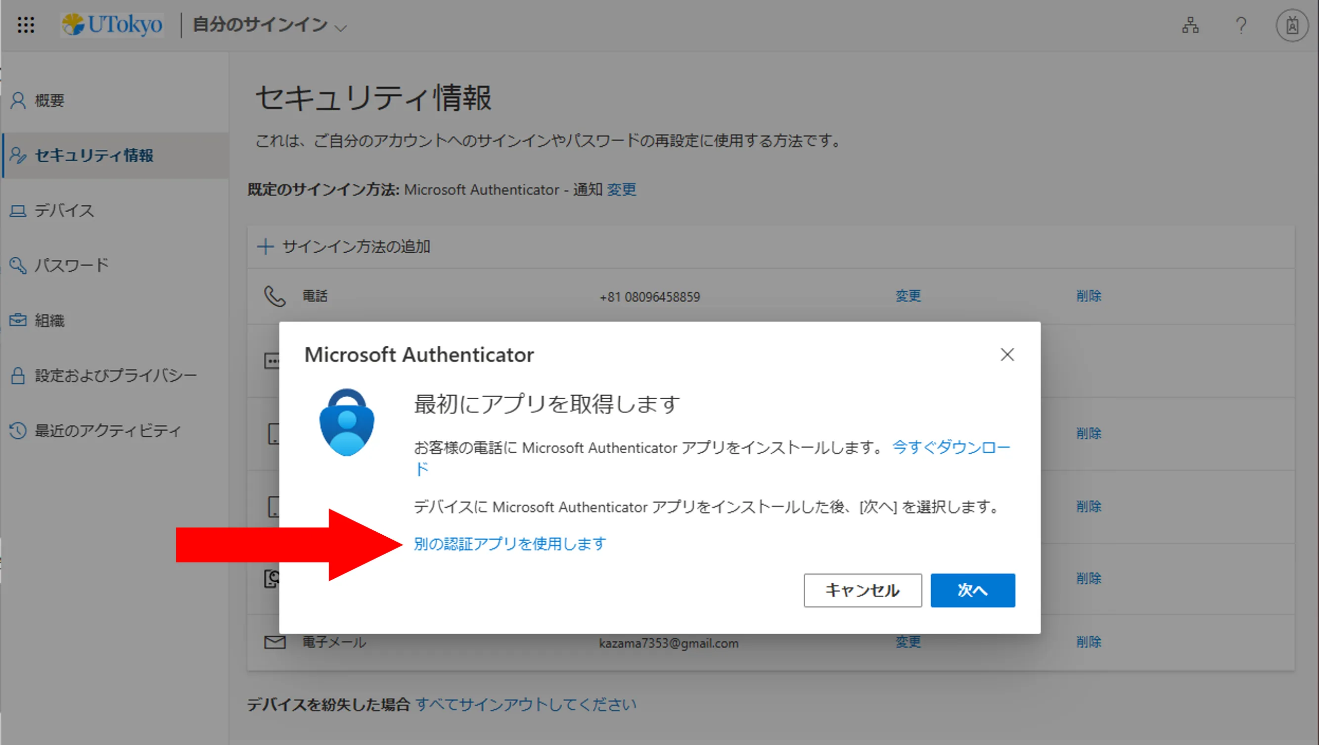 画面の中ほどにある「別の認証アプリを使用します」というリンクを探して押してください.