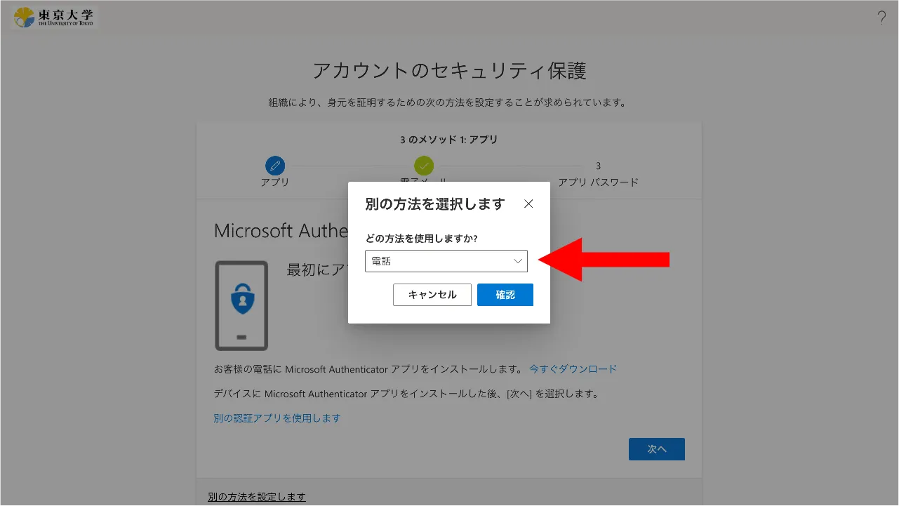 「どの方法を使用しますか?」欄で「電話」を選び,「確認」を押してください.