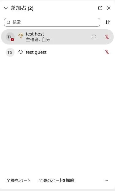 - マイクのアイコン: マイクのアイコンが赤くなっている参加者は,マイクがミュート状態になっています.主催者は,参加者のマイクをミュートすることもできます.上の図では,test hostとtest userのマイクはミュート状態になっています.
