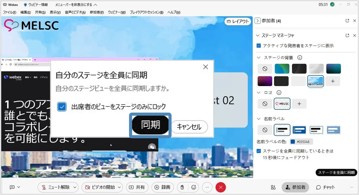 - 「同期」を選択し,ステージのレイアウトを出席者に同期します.
