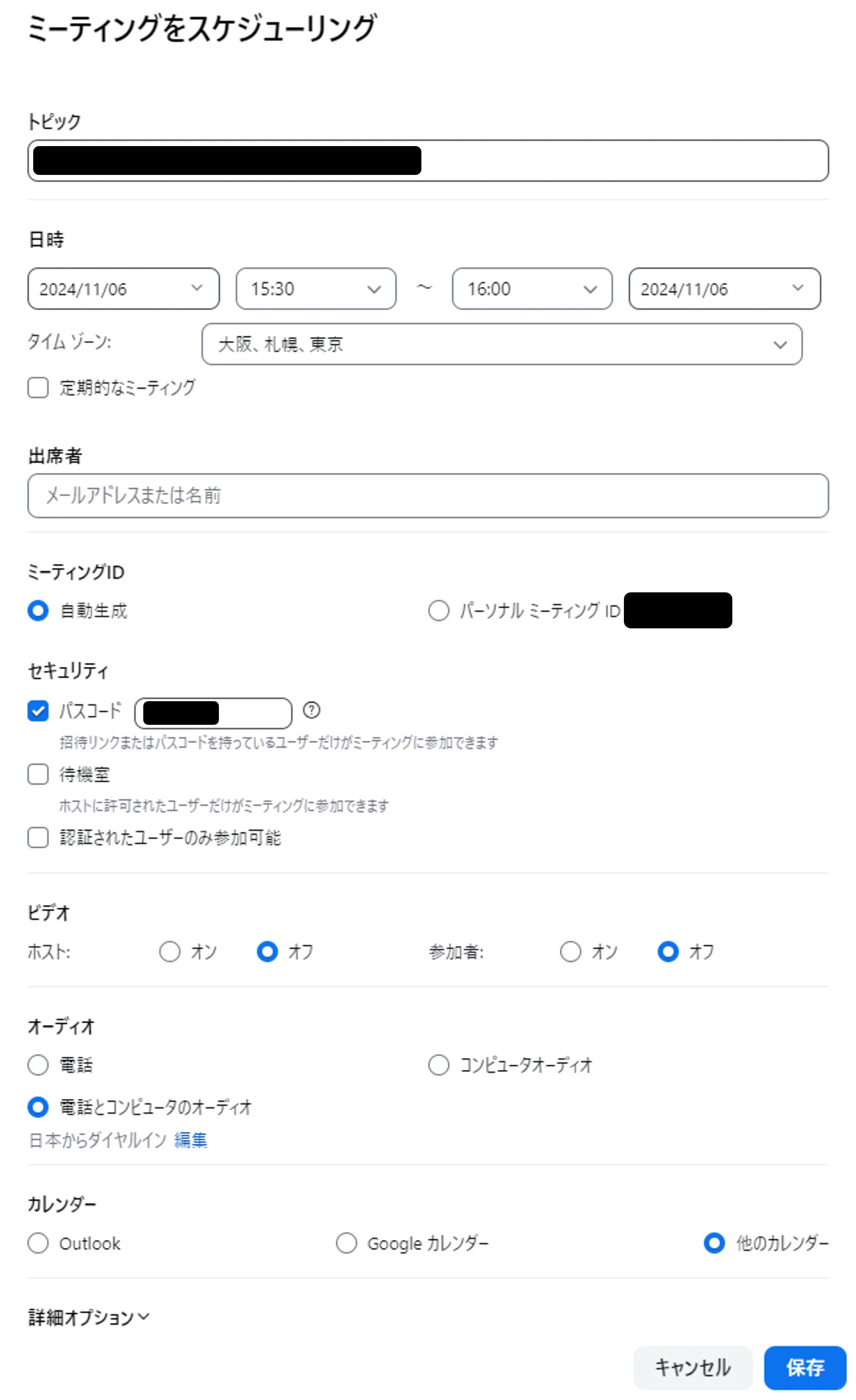 4. 右下の「保存」を押してください.ひとつ前の画面で「カレンダー」について「他のカレンダー」を選択している場合,下の画像のような画面が表示されます.「参加Zoomミーティング」の下に記載されているミーティングの URL やミーティングID,パスコードなどを抜き出して,メールなどを用いて参加者に通知してください.