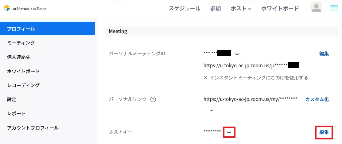 - “Meeting”欄まで移動し,「ホストキー」の横にある瞳のアイコンをクリックしてください.表示された6桁の数字がホストキーです.