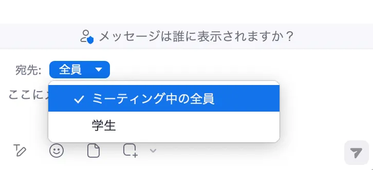 - 全員:参加者はミーティングに参加している全員に向けてチャットを送れます.