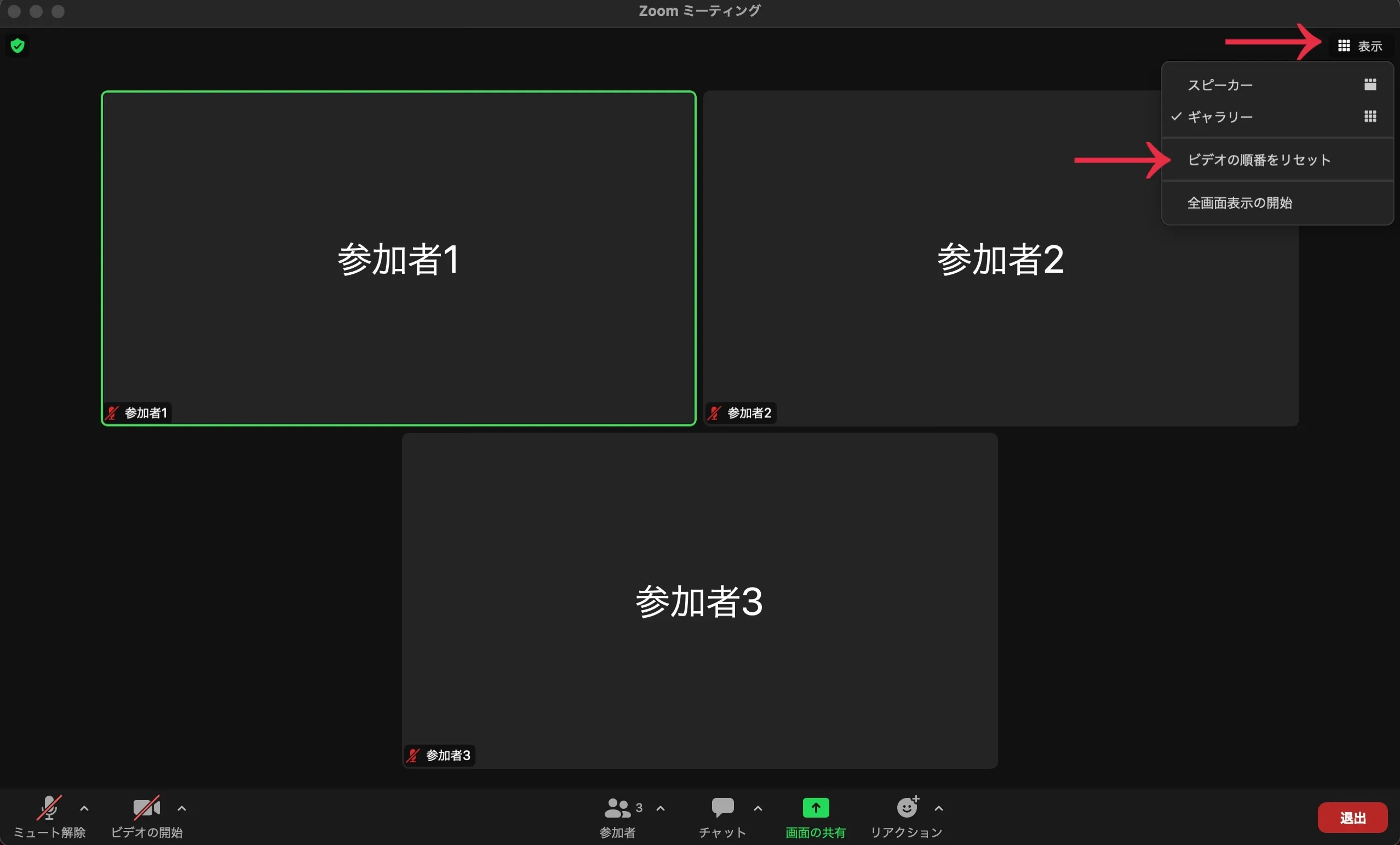 スピーカービューとギャラリービューの切り替えは,画面右上の「表示」を押した後,表示されるウィンドウで「ギャラリー」または「スピーカー」を押すことで切り替えることができます.