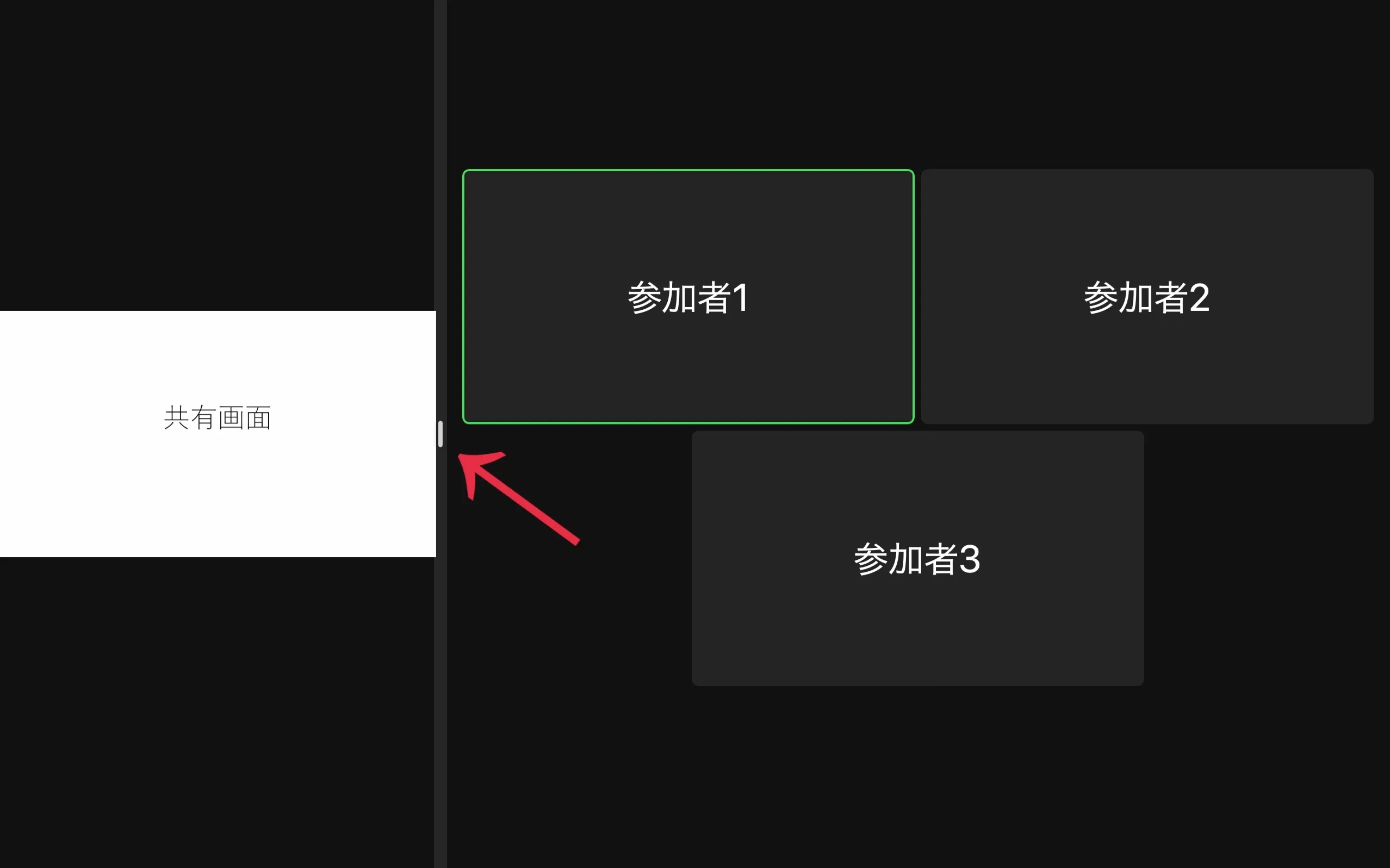 左右表示の設定では,共有画面と参加者のビデオを区切るセパレータを調整することで,共有画面と参加者のビデオの大きさの比率を変更することが可能です.