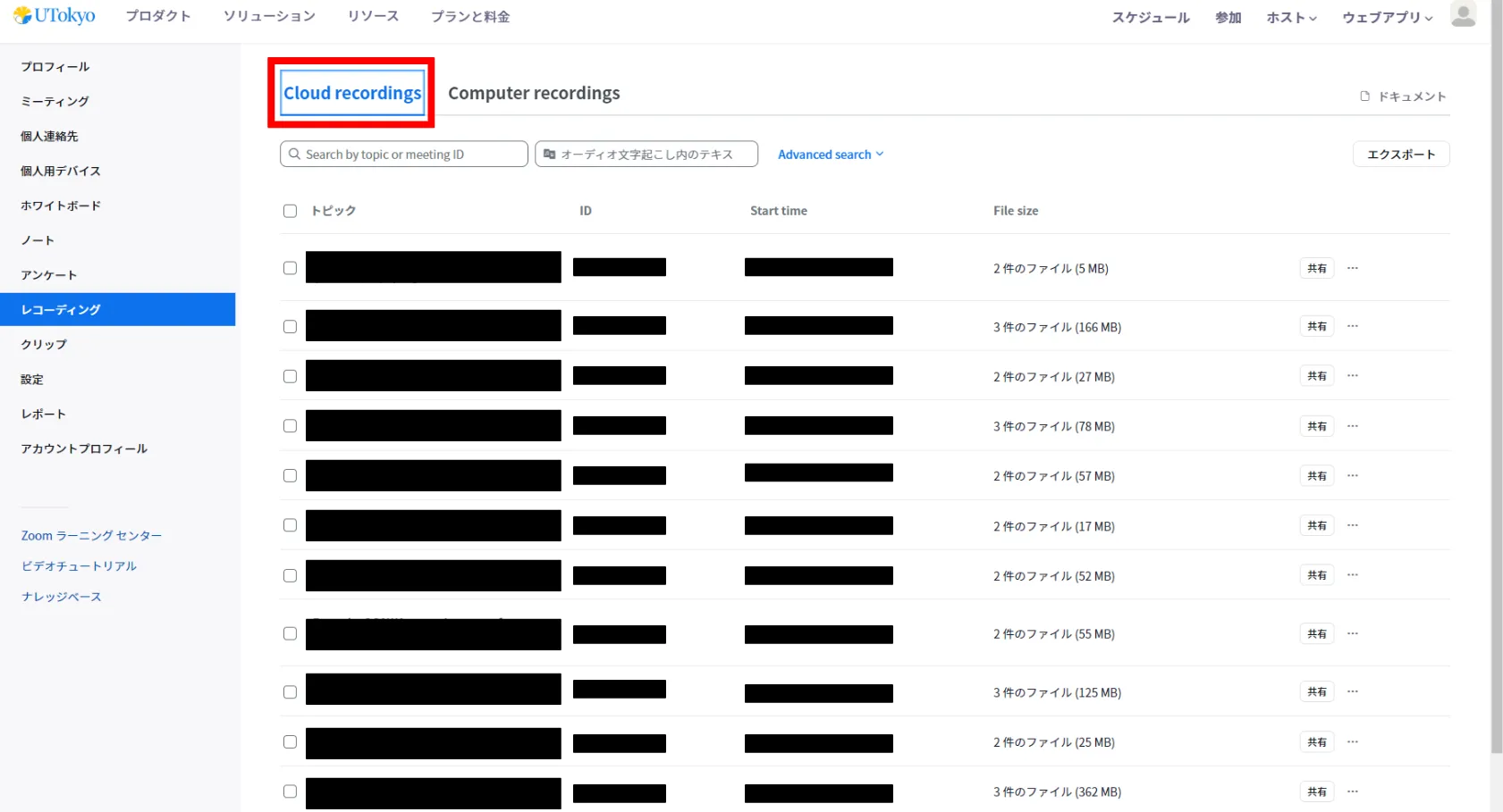 Zoomのクラウドに保存できるクラウドレコーディングの容量には限りがあり,東京大学が契約しているZoomライセンスにも大きな費用がかかってしまっています.そのため,必要のないクラウドレコーディングの削除にご協力お願いします.詳しくは,「Zoomクラウド録画における不要なデータ削除等のお願い」のページもご確認ください.